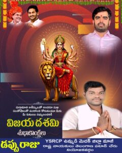 తెలుగు రాష్ట్ర ప్రజలందరికీ దసరా శుభాకాంక్షలు తెలిపారు వైఎస్ఆర్ కాంగ్రెస్ పార్టీ ఉమ్మడి మెదక్ జిల్లా మాజీ రాష్ట్ర నాయకులు డప్పురాజు. చెడుపై మంచి గెలుపుని ప్రతిబింబించే ఈ పండుగ ప్రతి కుటుంబంలో ఆనందం, సిరిసంపదలు నింపాలని ఆయన ఆకాంక్షించారు.